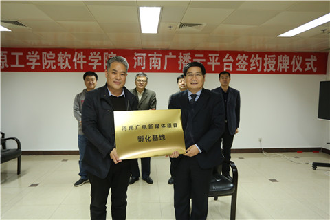 随后,我校软件学院院长车战斌和河南广播电视台(广播)总工程师常智明分别代表双方签署了合作协议。车战斌院长向河南广播电视台授予“中原工学院软件学院实训基地”牌匾,河南广播电视台(广播)工程师常智明向软件学院授予“河南广电新媒体项目孵化基地”牌匾。